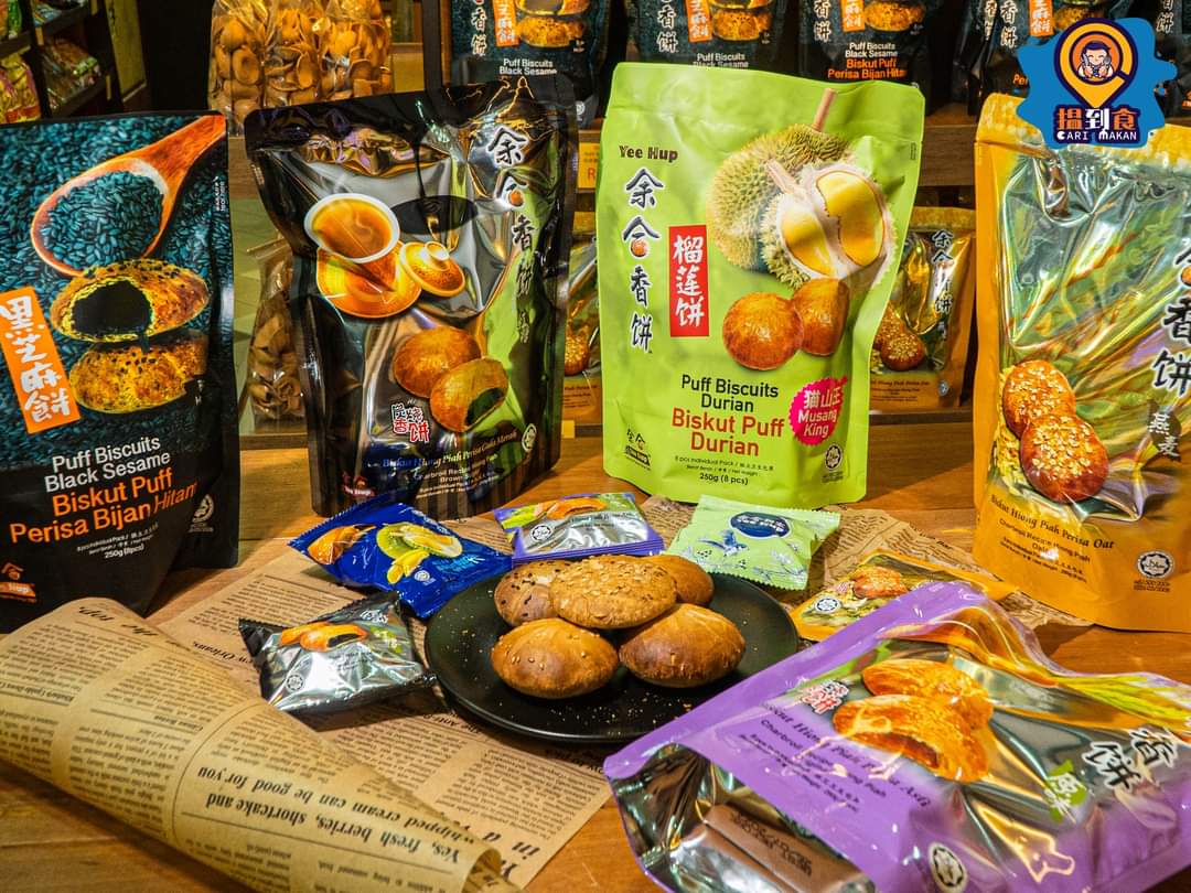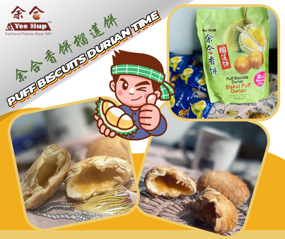 Yee Hup Biskut Puff Durian / Yee Hup Hiong Piah (Biscuit) Durian / 余合迷你榴莲饼 ------------------------------------------------------------- Specifications: 8pcs individual pack / 1 pack/ 250gm Product Description: Wheat flour, syrup, durian paste, sugar, palm oil, custard powder, water. Allergen Ingredients: Wheat. Shelf Life: 12 months Product Comply with: ISO9001, ISO22000, HACCP & HALAL (JAKIM) Warranty Type: No Warranty ------------------------------------------------------------- 8包独立包装/ 250克 -------------------------------------------------------------